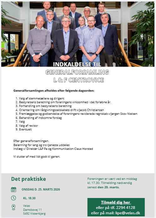Centrovice.dk » Arrangementer » GENERALFORSAMLING L&F CENTROVICE GENERALFORSAMLING L&F CENTROVICE TILMELD DIG HER Andre kommende arrangementer Velas PlanteTræf 2026 11 June 2026, kl. 11:00-19:00 Labing Møllevej 8462 Harlev
